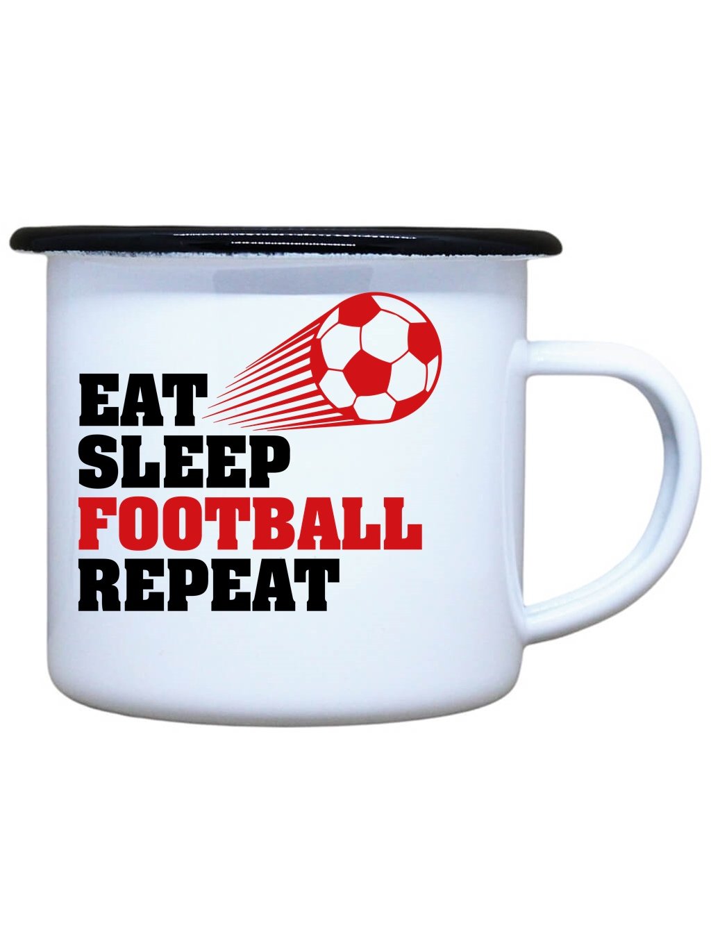 Nostalgický smaltovaný hrnek s černým okrajem z nerezové oceli od Dobrýtriko.cz je ideálním společníkem každého fotbalisty. Stylový plecháček s potiskem Eat sleep football je vhodný na Váš čajík, kafíčko nebo třeba i pořádný grog. Neotřelý dárek nejen k svátku, narozeninám, na Vánoce nebo k Valentýnu. Plecháček s potiskem Eat sleep football je skvělý parťák na toulky přírodou, ale i na každodenní používání ve Vaší domácnosti. Kvalitní potisk s dlouhou životností.