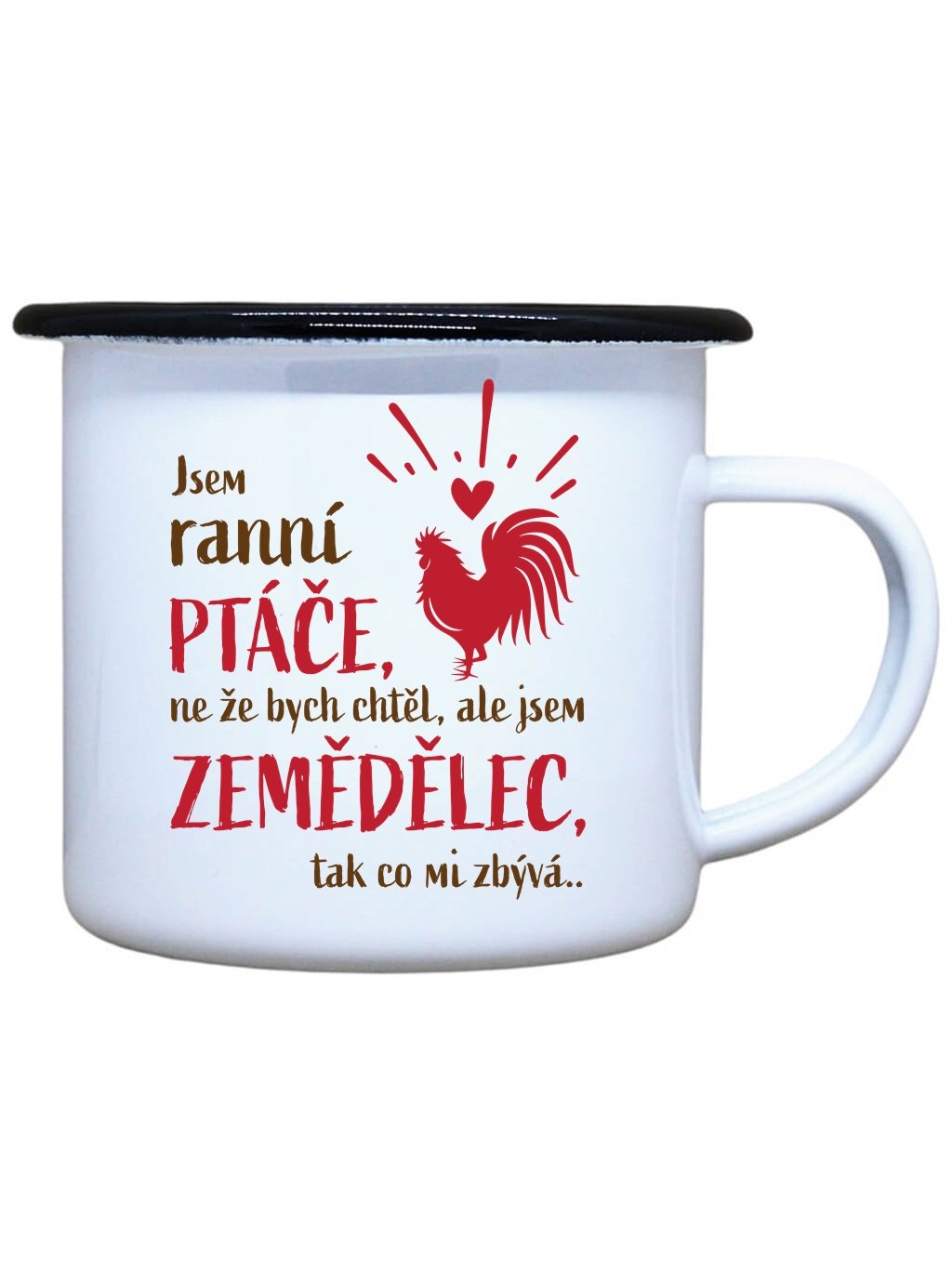 Nostalgický smaltovaný hrnek s černým okrajem z nerezové oceli od Dobrýtriko.cz je ideálním společníkem každého zemědělce. Stylový plecháček s potiskem Ranní ptáče je vhodný na Váš čajík, kafíčko nebo třeba i pořádný grog. Neotřelý dárek nejen k svátku, narozeninám, na Vánoce nebo k Valentýnu. Plecháček s potiskem Ranní ptáče je skvělý parťák na toulky přírodou, ale i na každodenní používání ve Vaší domácnosti. Kvalitní potisk s dlouhou životností.